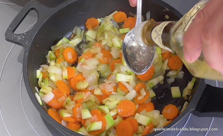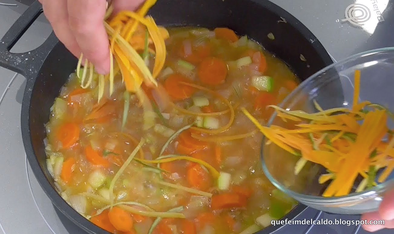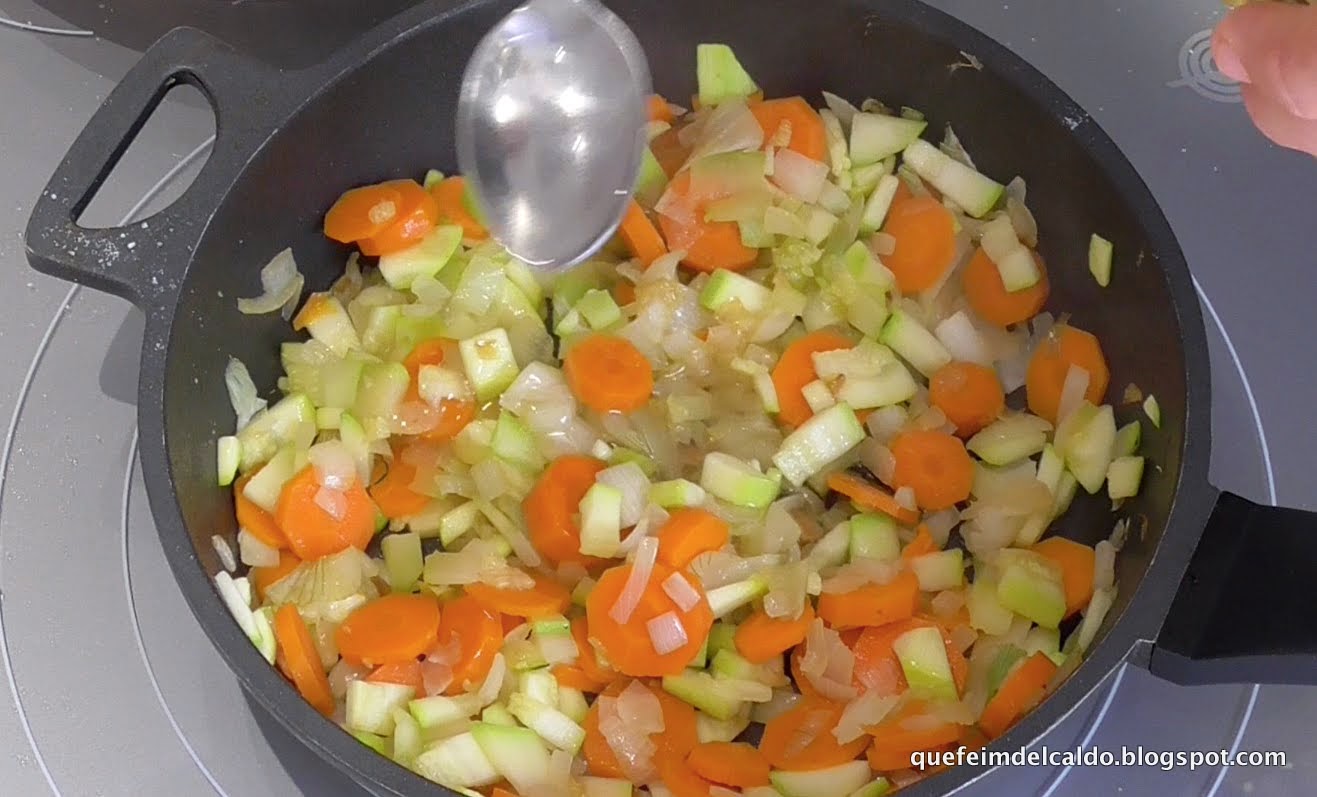 Más tarde ponemos el calabación limpio que previamente habíamos hecho sudar con una cucharadita de café de sal, para eliminar el amargor del calabacín.