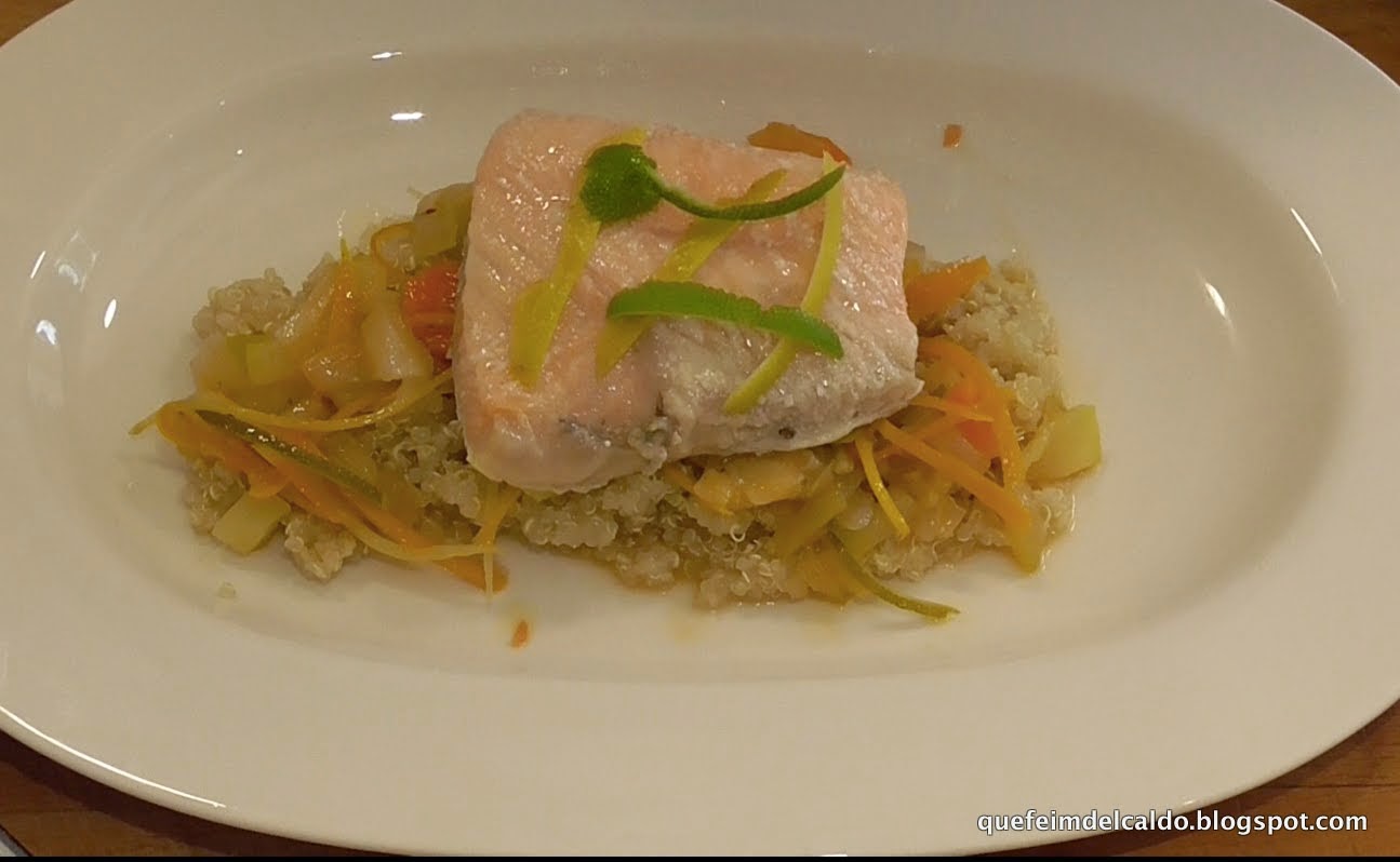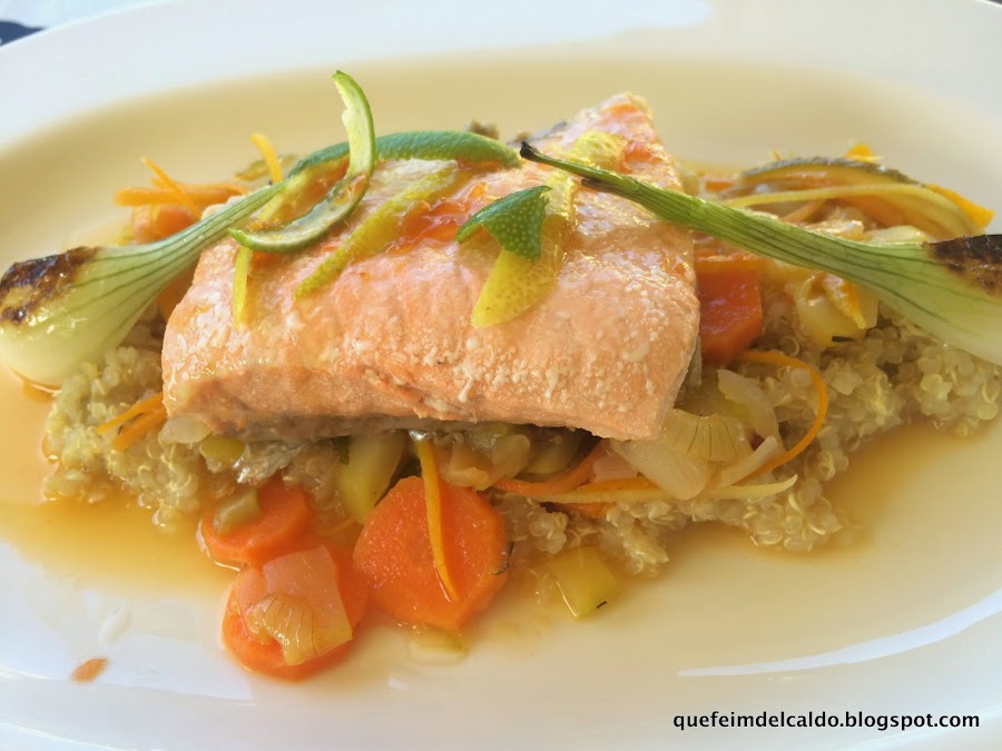 Hoy vamos con una receta que hemos sacado del gran libro de Joan Roca llamado "Cocina con Joan Roca", esta receta combina varios ingredientes y varios tipos de tratamiento de los mismos. Por una parte lleva cereales, por otra se hace un escabeche aprovechando jugo de los cítricos y por último hacemos un confitado de salmón. El resultado es una explosión grande de sabores distintos pero que combinan a la perfección.