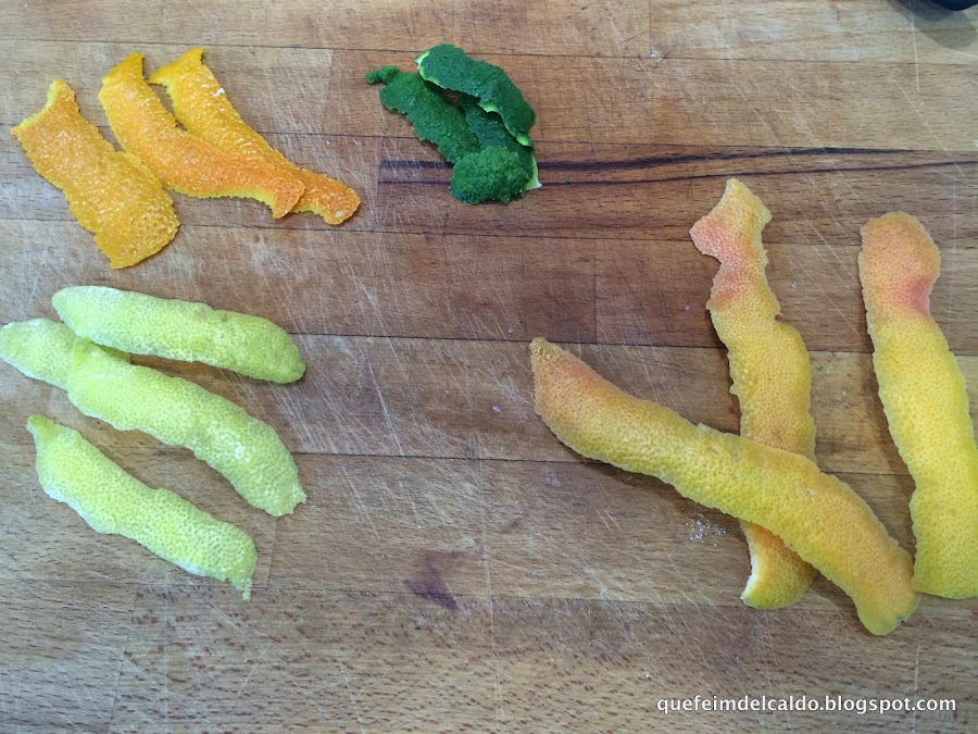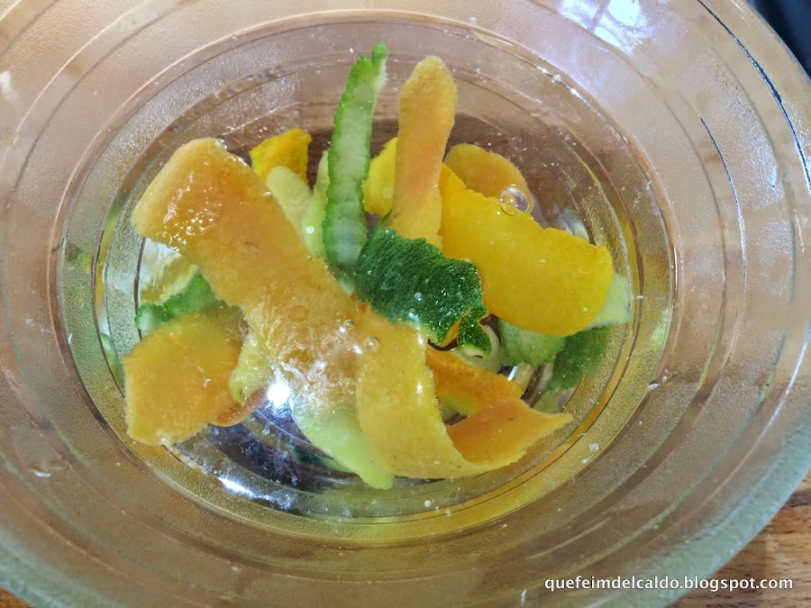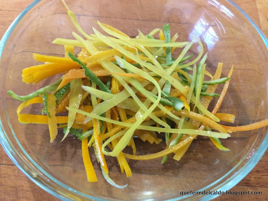 Cortamos las pieles de lso cítricos en tiras muy finas y largas.