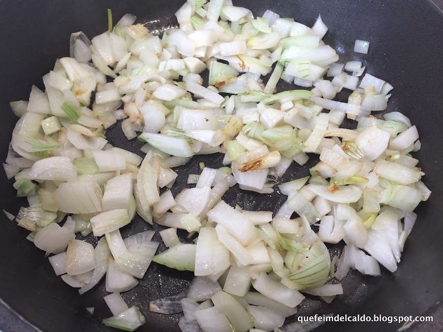 En una sartén ponemos la cebolla tierna que hemos cortado muy fina a pochar.