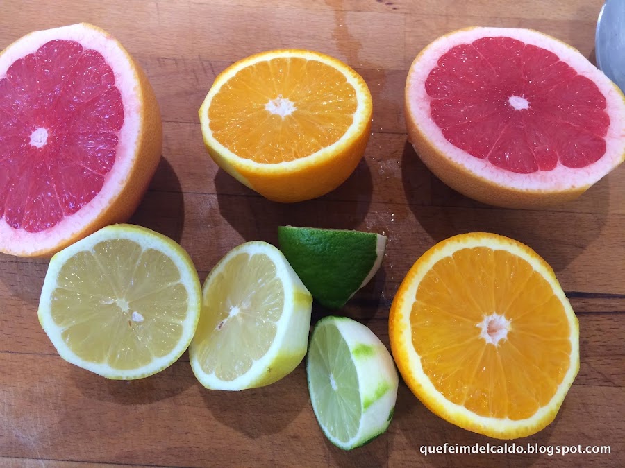 Mientras la quinoa está en remojo vamos preparando los cítricos, para ello cogemos un pomelo, una naranja, un limón y una lima.