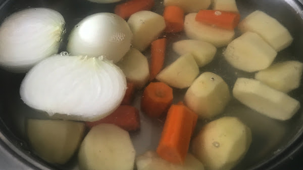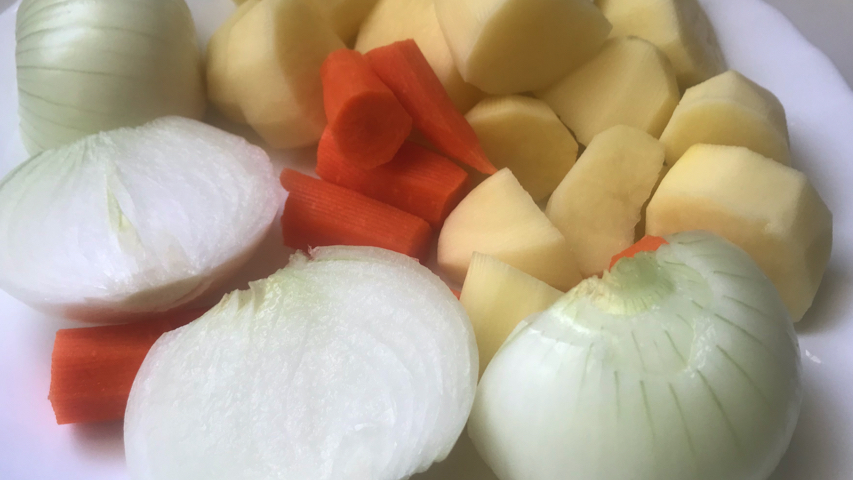 Introduce las patatas, las cebollas y las zanahorias.