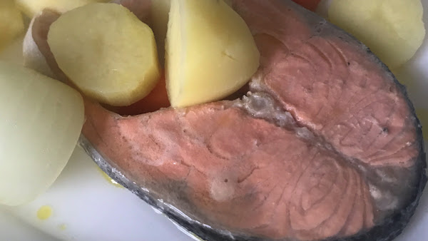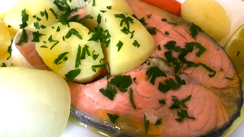Lo puedes servir como si fuera una sopa con todos los ingredientes o como yo he hecho en esta ocasión: pescado y verduras solamente, sin caldo.
