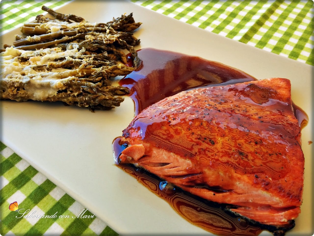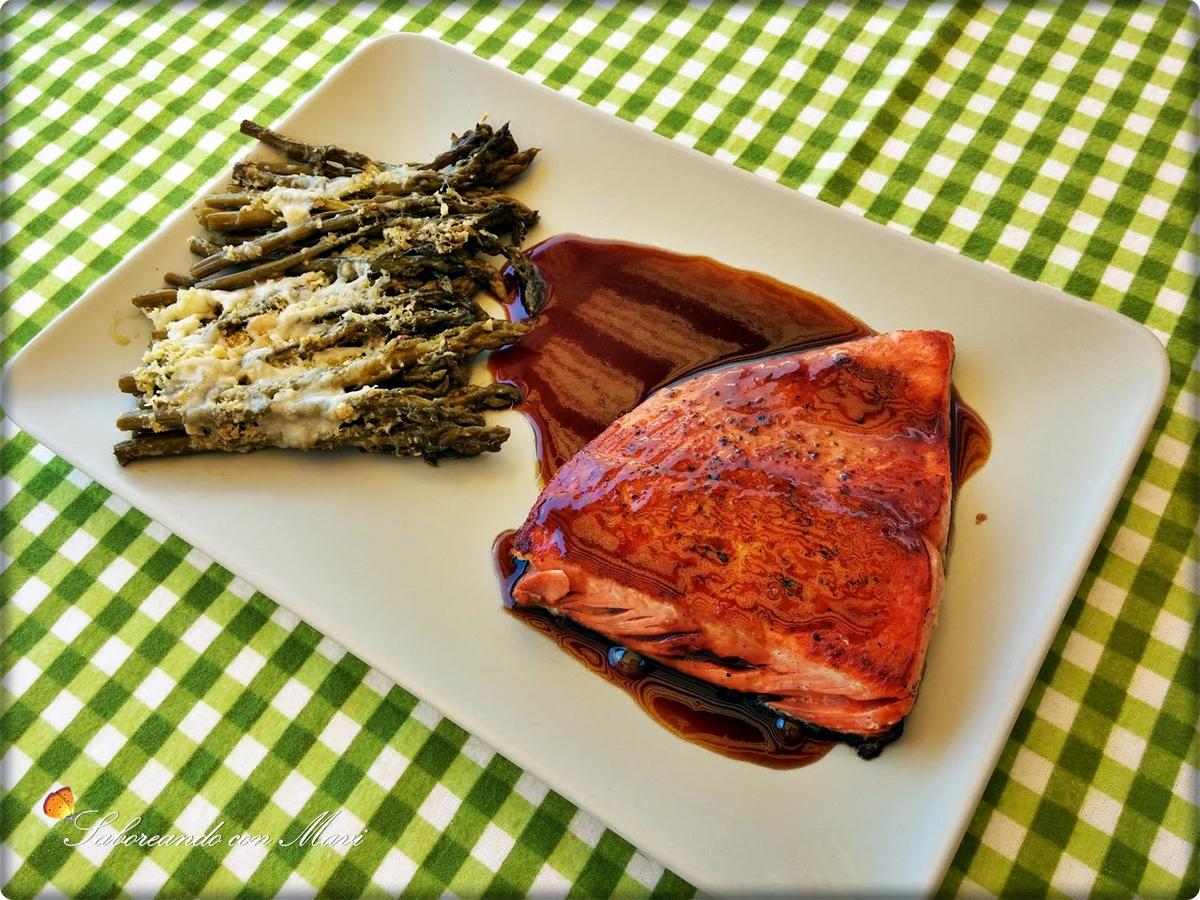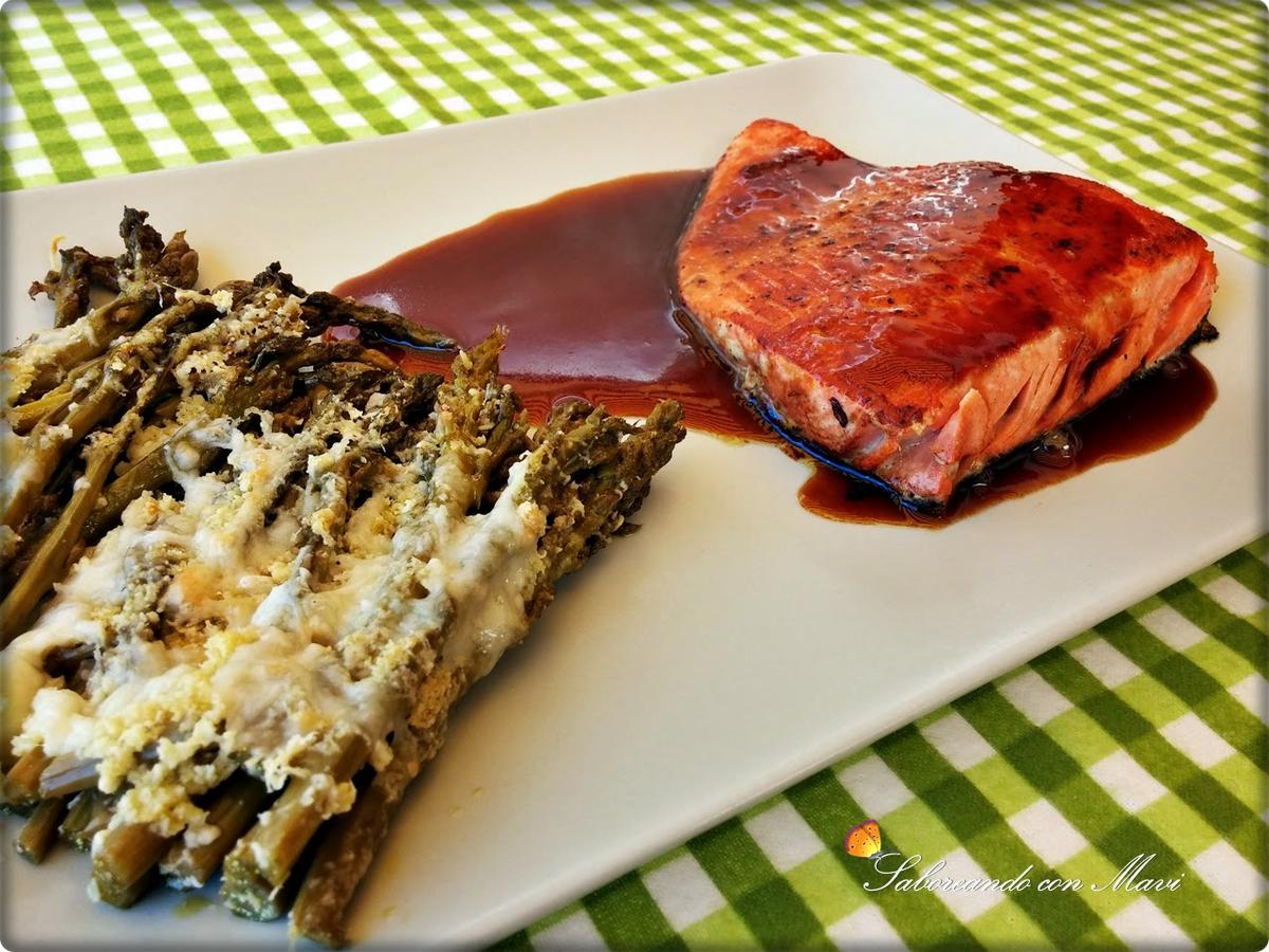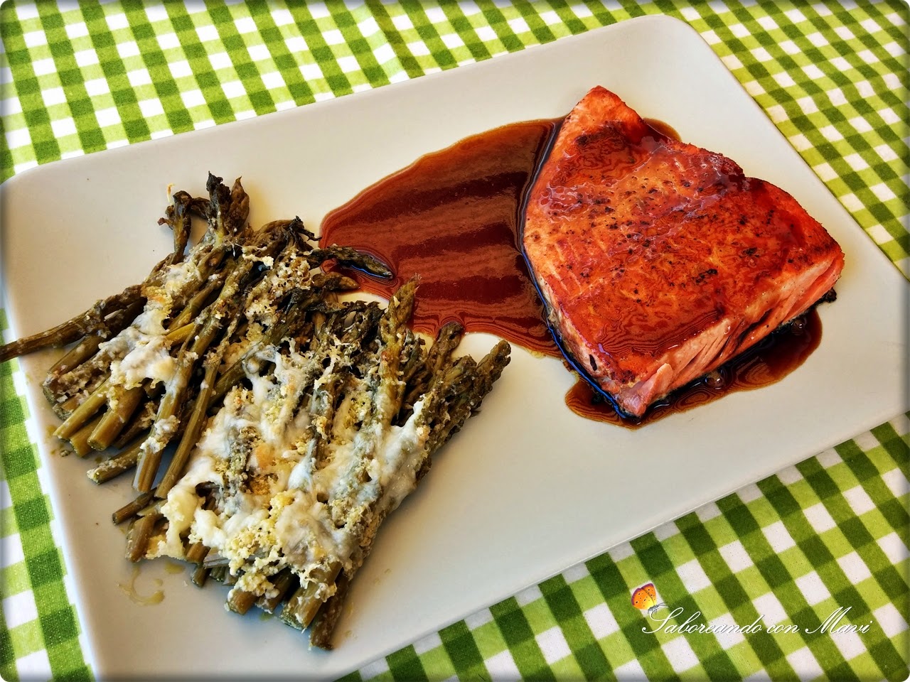 Dos minutos más y ya está listo. Enplatamos regando el salmón con el resto de salsa y acompañamos con los espárragos trigueros gratinados.