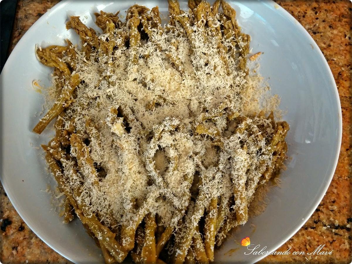 Escurrimos los espárragos y los ponemos en un recipiente que resista el horneado. Los espolvoreamos con queso y reservamos.