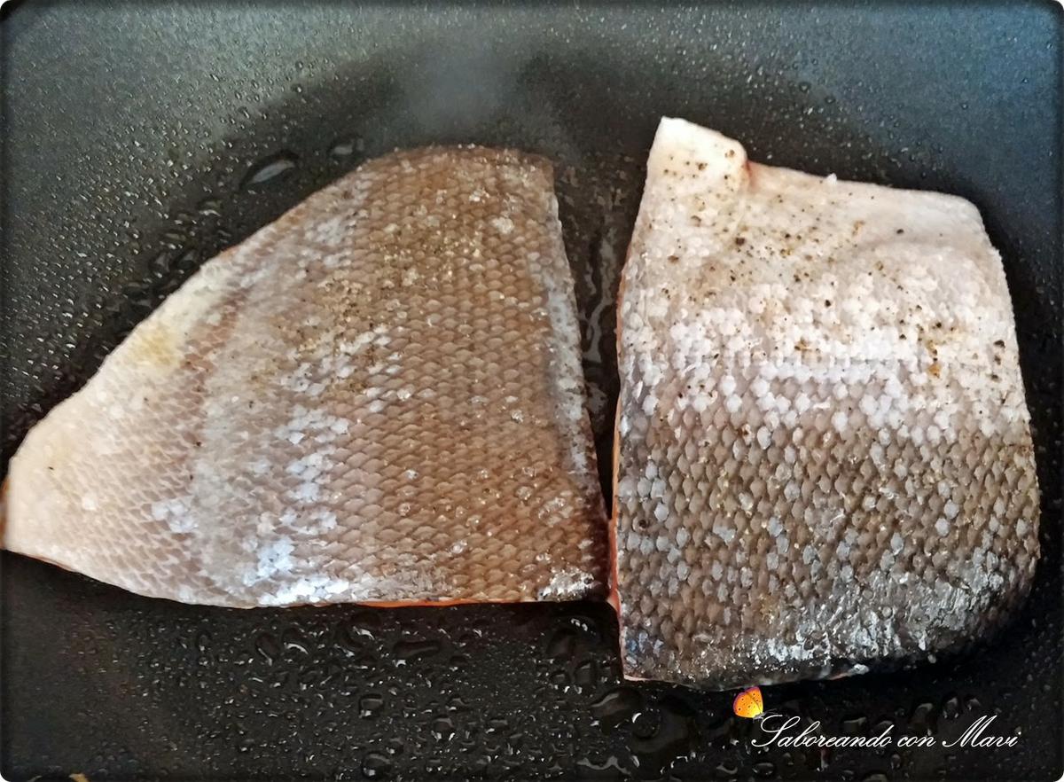 El salmón lo salpimentamos sin pasarnos de sal. Echamos un poquito de aceite en una sartén y ponemos el salmón con la piel hacia arriba.