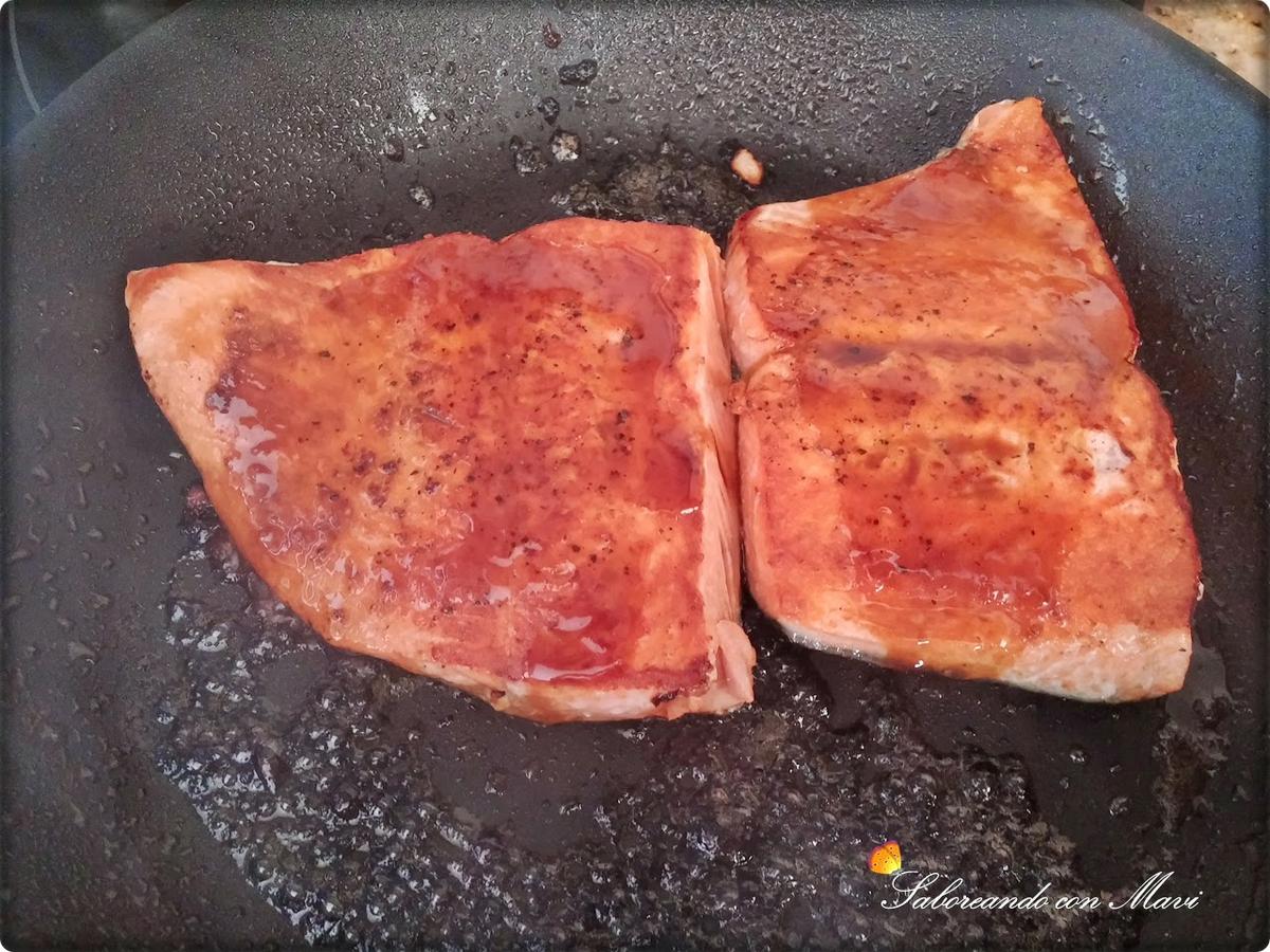 Mientras ponemos el gril en el horno y metemos a gratinar los espárragos. A los dos minutos le damos la vuelta al salmón y le ponemos encima de la parte hecha una cucharada de la salsa.