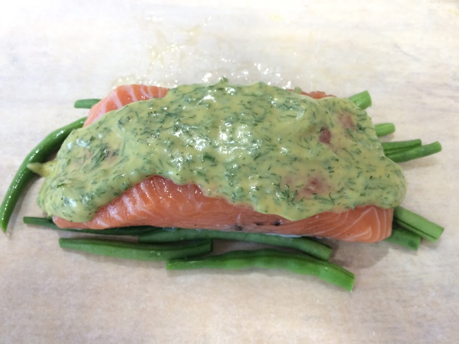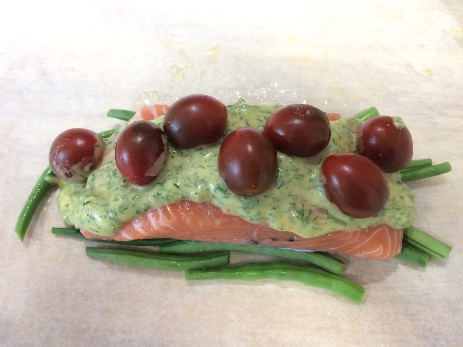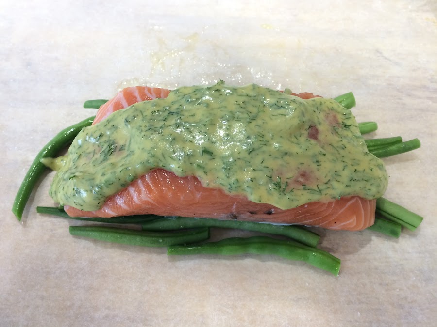 Ponemos la salsa sobre el lomo de salmón.