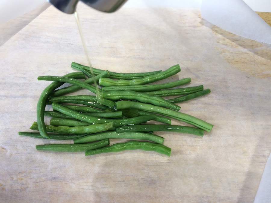 Empezamos ya a montar el papillote, montamos una capa de judías verdes sobre el papel vegetal.