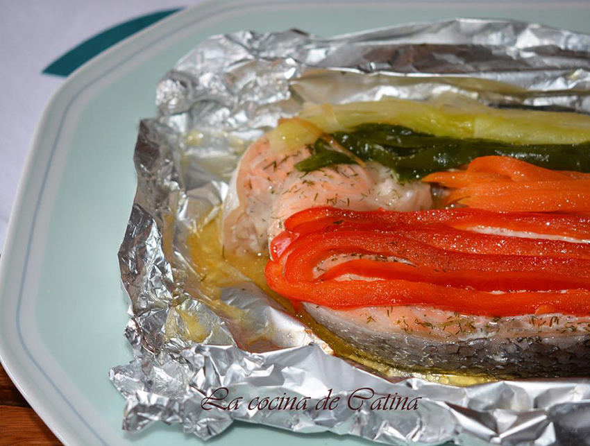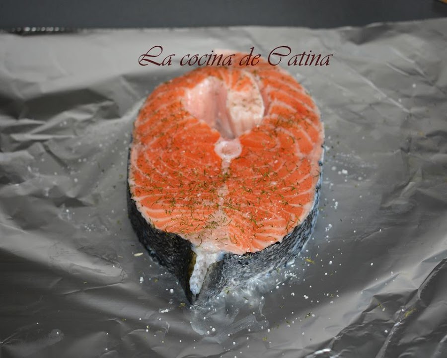 Ponemos las láminas de papel de aluminio en la encimera o mesa de trabajo, colocamos encima una rodaja de salmón con un poco de sal y un poco de eneldo.