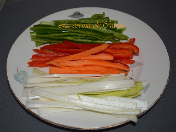 Lavamos y cortamos la zanahoria, el puerro, pimiento verde y pimiento rojo en tiras finas.