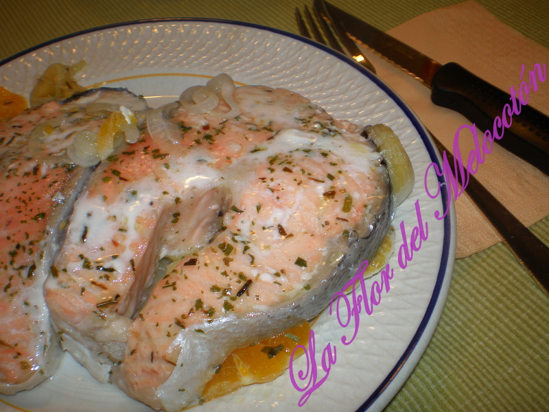 Cuando fuimos a comprar el pescado para hacer el arroz caldoso, vi que tenían salmón a muy buen precio. Como hacía días que no comíamos pescado, no dudé en coger unas rodajas, me salieron algo más caras, porque el buen precio era para el salmón entero y era enorme, pero la receta quedó buenísima.