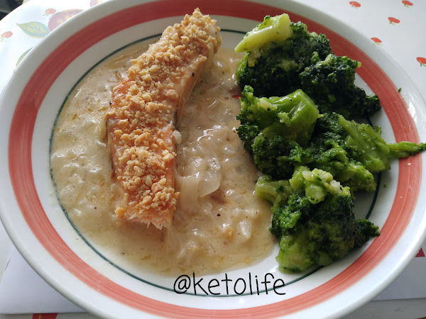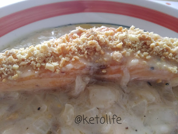 En una sartén con un poco de aceite de oliva doramos las tiras de salmón, las sacamos a una fuente de cristal apta para horno y en esa misma sartén doramos la cebolla picadadita. Cuando está un poco dorada añadimos la leche de coco con la maicena, un poco de sal y pimienta molida, revolvemos todo un rato e incorporamos el zumo de limón.