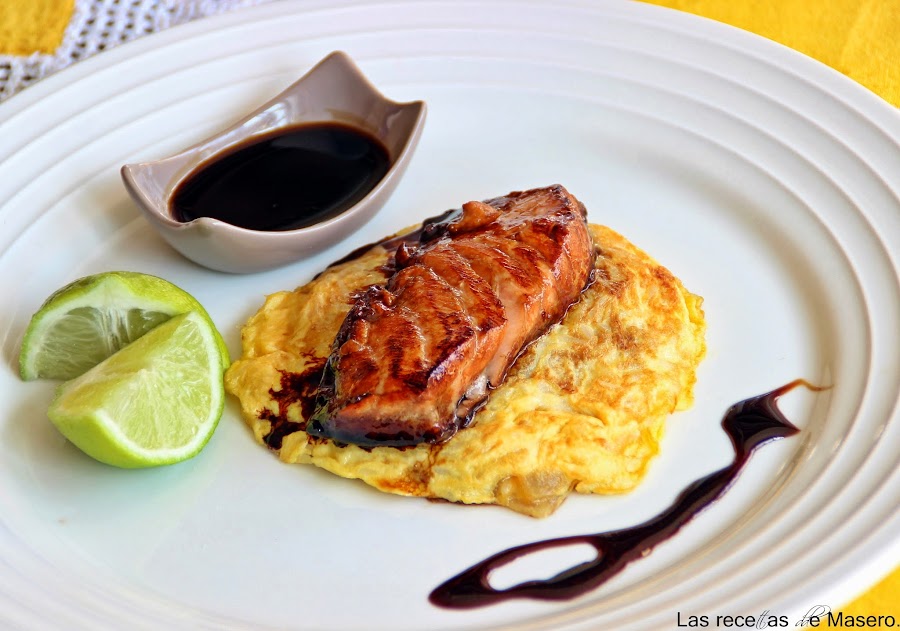 La verdad que el salmón es de los únicos pescados que no me gustan, pero mi fiel catador le dio el visto bueno, repitió y rebañó el plato, lo que hace pensar que le gustó bastante. Es una manera distinta de preparar el salmón, se hace en muy poco tiempo y la tortilla de arroz le da el toque perfecto.