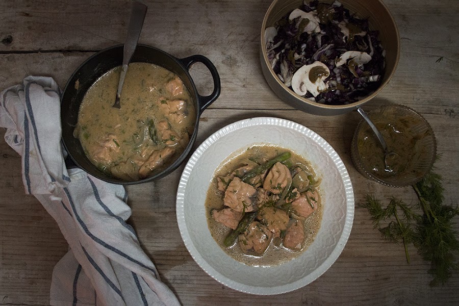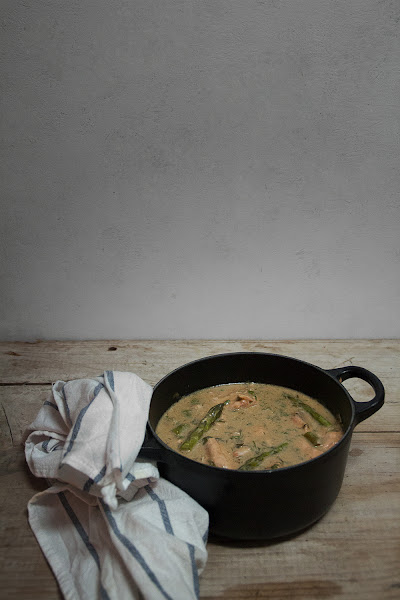 En este caso me decidí por dos de los ingredientes indispensables en toda despensa que se precie de más arriba de Bruselas, el salmón y el eneldo. Con estos dos ingredientes hay como setenta recetas diferentes y cada cual mejor aún, desde el fantástico Gravlax (salmón marinado), hasta un salmón con rabanitos y eneldo que pronto también veréis por acá. Como ha empezado el frío (ya era hora, por otro lado...como está el tiempo eh?... bueno, dejemos la conversación de ascensor), me decanté por este plato de cuchara y pan, eso sí, que no se os olvide el pan por que está de muerte esa salsita.