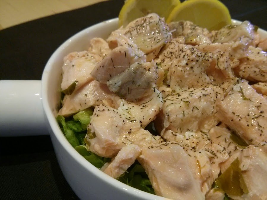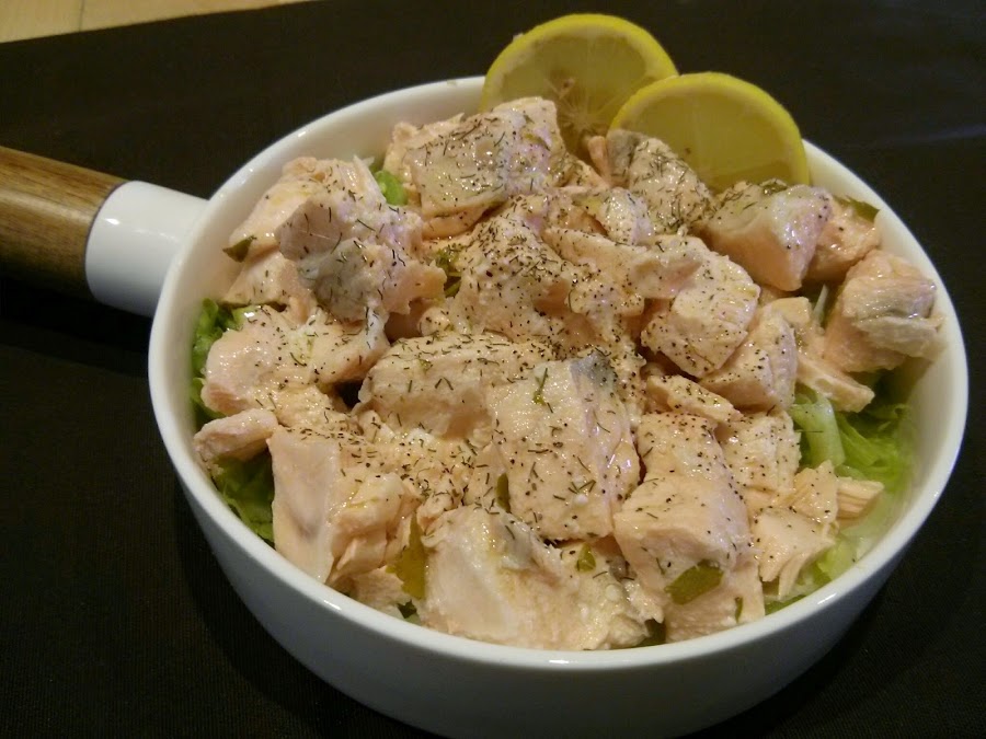 - Poner el salmón en cubitos en un cuenco apto para microondas y mezclar con la sal, el zumo de limón, 1/2 vaso de agua, aceite y perejil