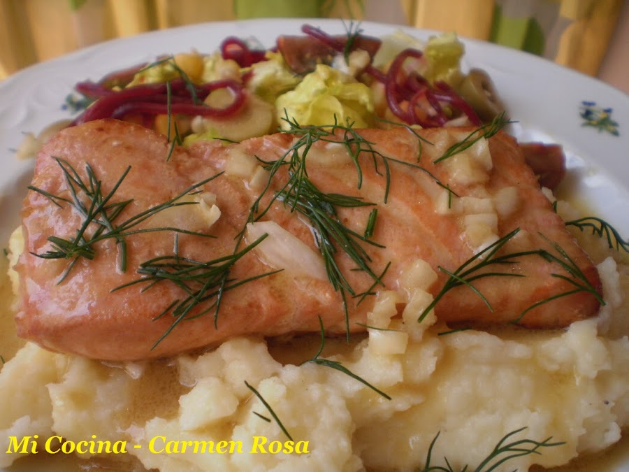 Colocar el puré de patatas (procurando que esté caliente), colocar el salmón, salsear al gusto y adornar con hojas de eneldo.