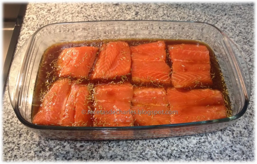 En una bandeja de horno ponemos un chorrito de aceite y colocamos el salmón con la piel para abajo. Vertemos por encima el caldo que hemos preparado antes y que ya debe estar frío, cubrimos con papel film y guardamos en la nevera al menos durante dos horas para que se marine el salmón. Cada cierto tiempo movemos bien la bandeja para "regarlo". No es necesario salar el pescado porque la salsa de soja ya tiene un sabor salado suficientemente potente.