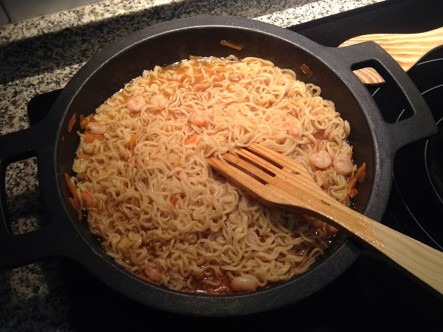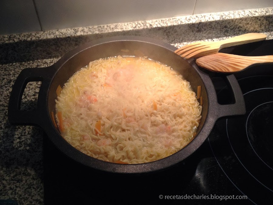 Mientras se nos cocina el salmón vamos preparando la guarnición de los fideos chinos. Los ponemos a cocer siguiendo las instrucciones del fabricante, junto con una zanahoria partida en tiras. Por otro lado en una sartén a parte preparamos las gambas a la plancha con un chorrito de aceite.