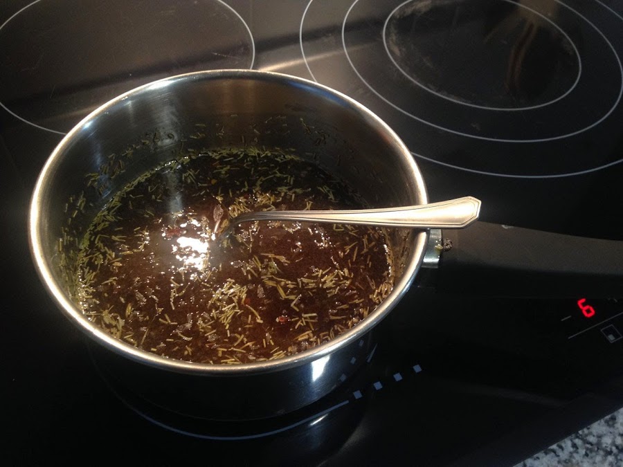 Comenzamos la receta preparando la salsa del marinado. Para ello, en un cazo vertemos el zumo de naranja junto con la salsa de soja, el azúcar, un poco de romero y una pizquita de pimienta cayena. Lo calentamos a fuego lento (sin que llegue a hervir en ningún momento) removiendo bien para mezclar todos los componentes. En el momento en que el azúcar esté disuelta, lo separamos del fuego y dejamos que se temple.