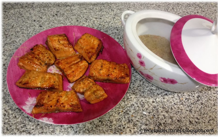 Y ya lo tenemos listo, lo podemos llevar servido todo junto o el salmón por un lado y los fideos por otro... Está delicioso! Que aproveche!!