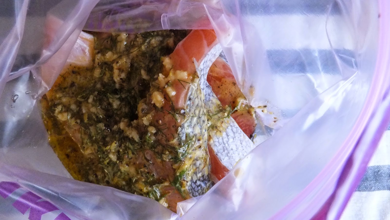 2. Vierte la mezcla de marinado en una bolsa hermética y añade el salmón. Mezcla bien todo hasta que el pescado quede bien impregnado y deja que repose en la nevera un mínimo de 20-30 minutos o toda la noche.