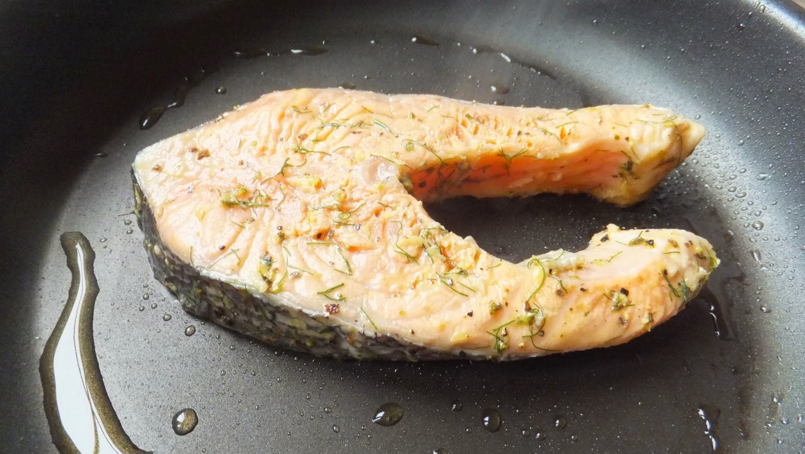 5. Separa el salmón del marinado mientras calientas una sartén antihaderente a fuego medio alto con un chorrito de aceite. Cuando la sartén este caliente añade el salmón con la piel hacia arriba y cocinalo durante 3-4 minutos por cada lado. (Es importante no dar demasiadas vueltas al salmón, con dos debería ser suficiente.) Para hacerlo a la sartén es mejor cortar el salmón en lomos que en rodajas, como en mi caso, para que la piel pueda tostarse bien y no se pegue. En caso de tener el samón en rodajas puedes hacerlo en el horno a 150ºC durante 15-20 minutos