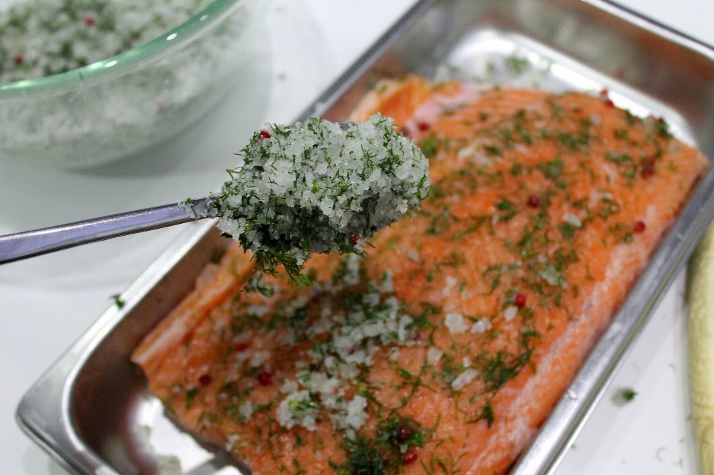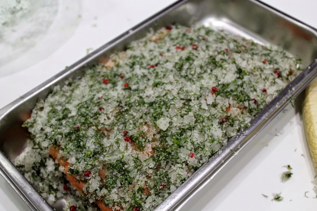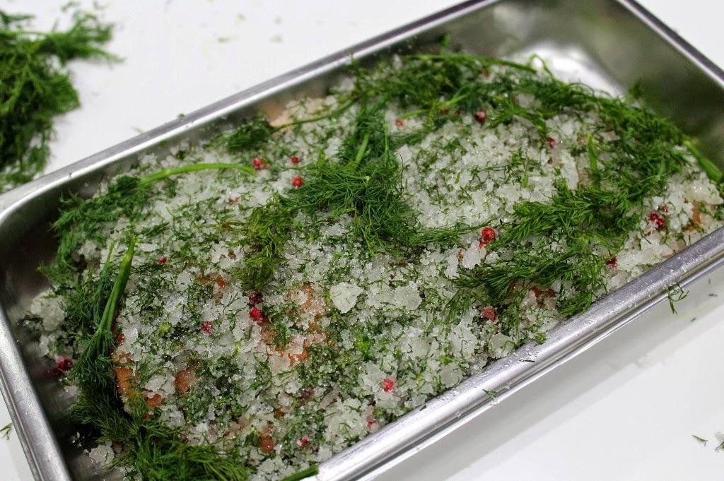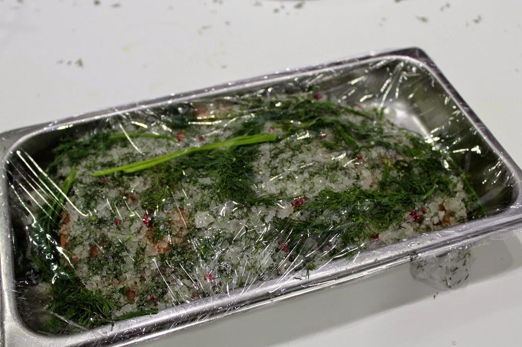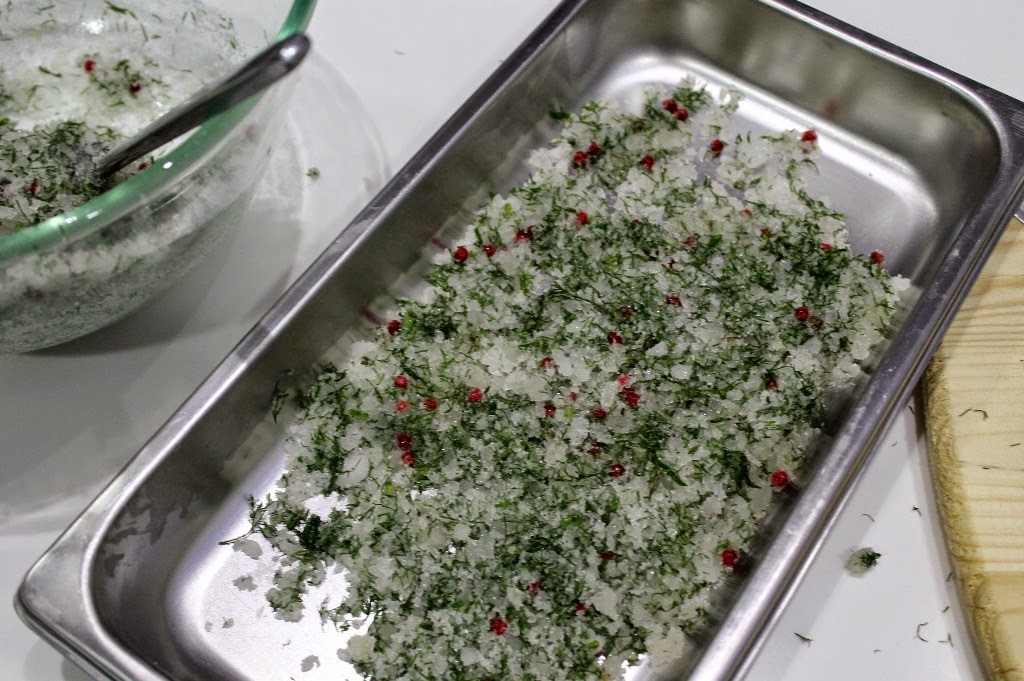 Se trata de cubrir el pescado con piel y desespinado con esta mezcla y dejarlo marinar en la nevera durante un tiempo con un peso encima, la mezcla que contiene sal hará que saque el agua que contiene y absorba los sabores de los ingredientes. Es muy importante no excederse de tiempo para que no quede seco.