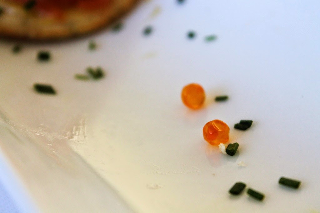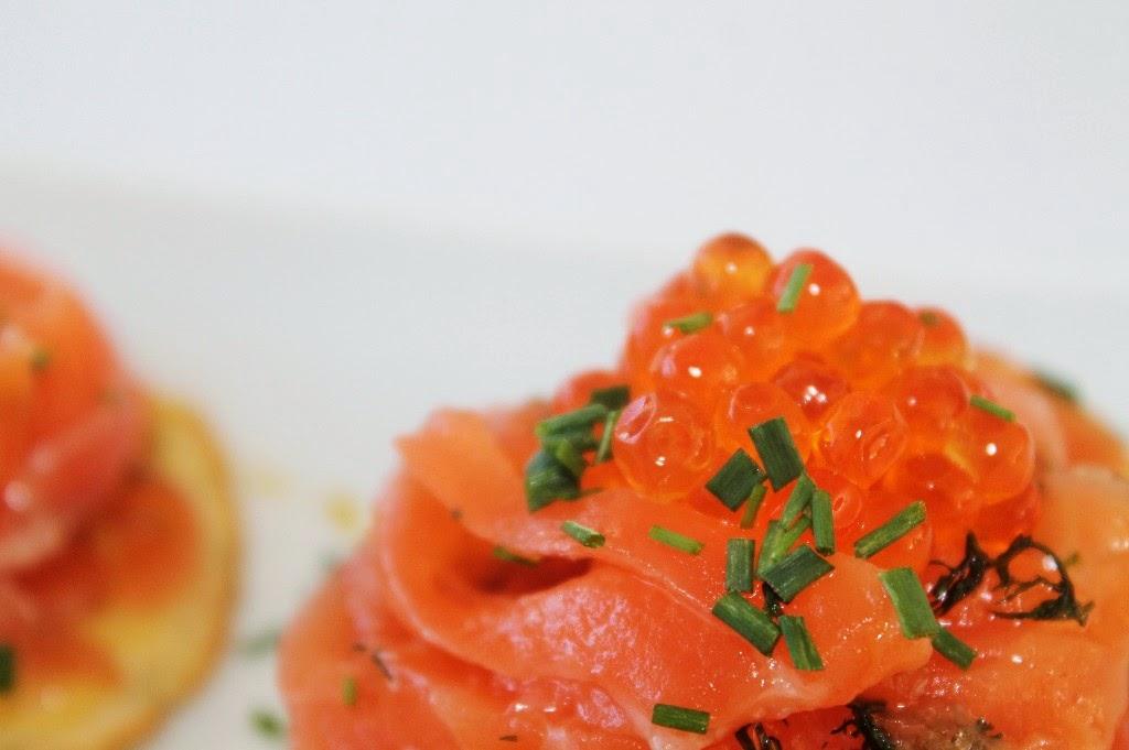 Calentar un poquito en el microondas los blinis, untarles un poco de la salsa de eneldo, colocar unas lonchas finas de salmón, ponerle unas huevas de salmón y espolvorear con eneldo o cebollino picado.