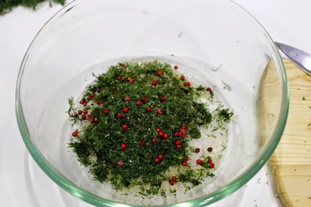En un bol mezclamos la sal, el azúcar, los granos de pimienta rosa, el chorrito de vodka y el eneldo picado, reservando unas ramas para decorar.