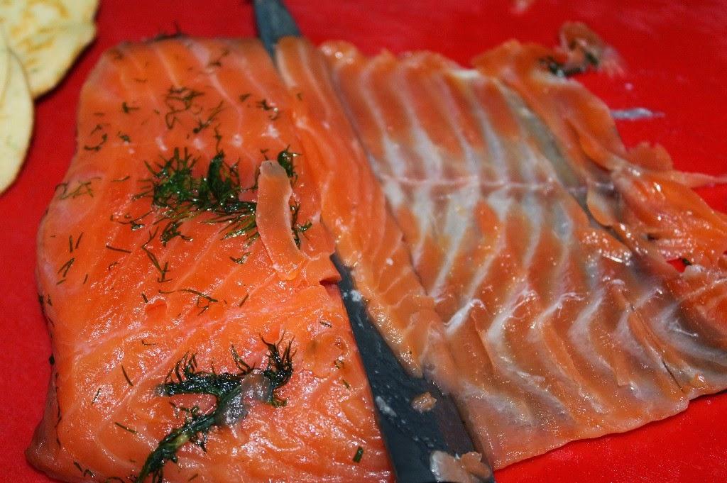 -Cuando saquéis el salmón de la nevera ya marinado, veréis que ha soltado mucho líquido eso es la acción de la sal sobre la carne del pescado, hace que se deshidrate y por eso se pueda conservar por mas tiempo.
