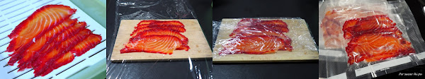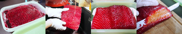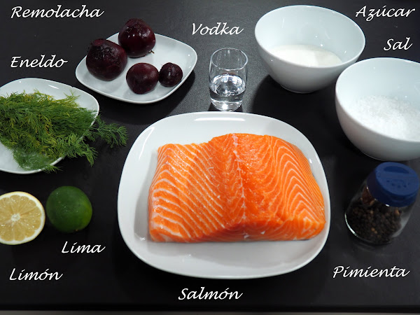 Colocar el salmón en un recipiente con la piel hacia abajo y cubrir la superficie con la pasta preparada. Cubrirlo con film plástico y poner un poco de peso encima (por ejemplo unos bricks de leche) y dejar reposar en nevera unas 24 horas como mínimo.