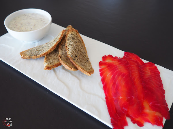 Lo hemos servido sobre unas tostadas caseras de pan de algas (para ver la receta hacer clic aquí), para reforzar el aire marino del producto, acompañado de la salsa de yogur aromatizada.