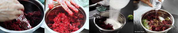 Añadir a la remolacha el eneldo, la sal, el azúcar, la pimienta, las semillas de cilantro, el vodka, las ralladuras de los cítricos y mezclarlo todo bien hasta formar una pasta homogénea.