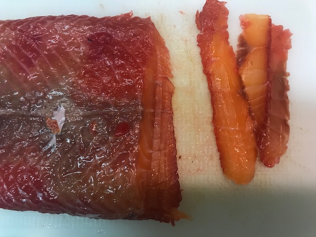 A las 48 horas desenvuelve el salmón, desecha la mezcla de remolacha (veras que se ha hecho bastante liquido), lava el salmón debajo del agua y ya esta listo para consumir, puedes hacerlo filetes y en sandwich, unas tartaletas con queso crema y unos dados de salmón...