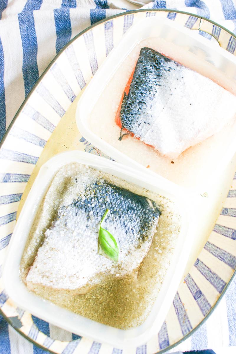 El recipiente que usemos, a ser posible que sea de plástico, debe ser algo más largo que el salmón, para marinarlos bien.