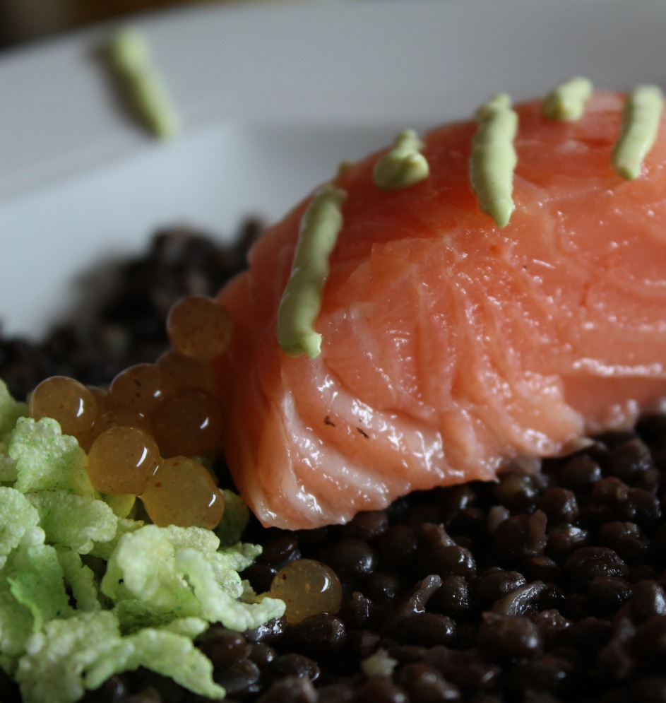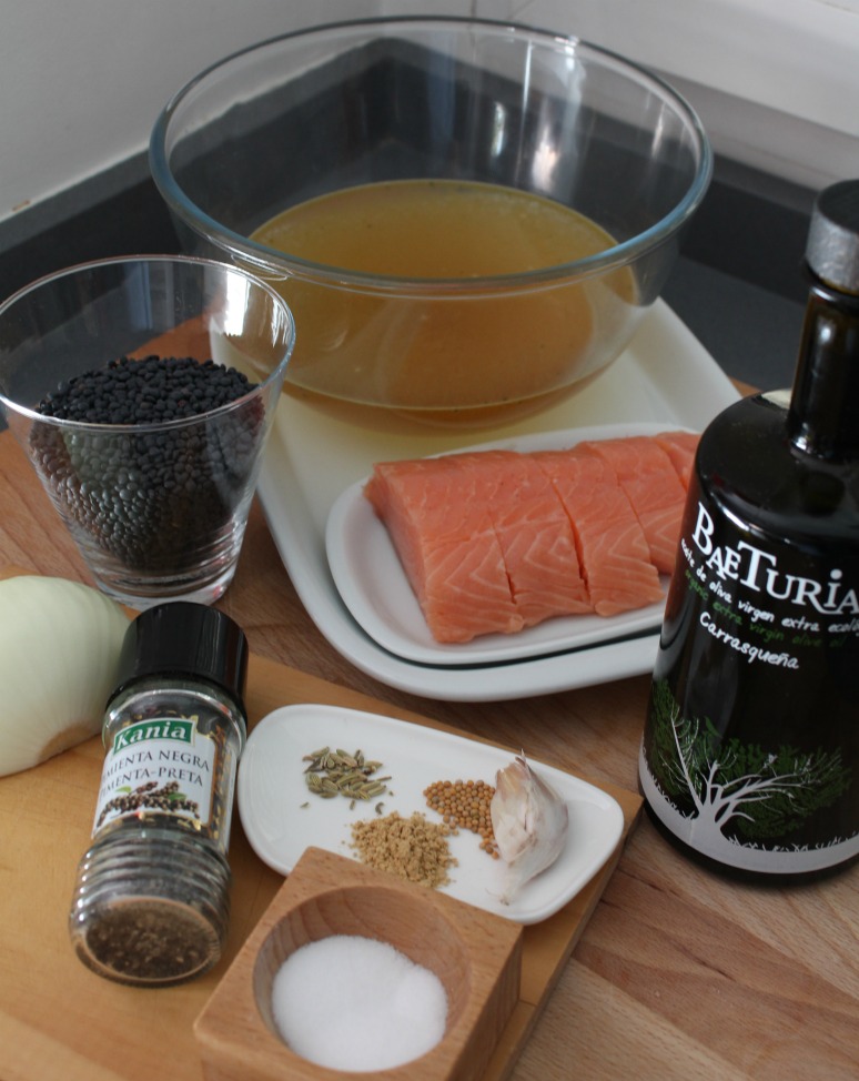 Troceamos con cuidado el salmón, en raciones; y lo colocamos sobre las lentejas.