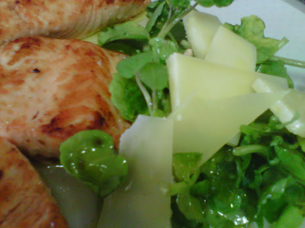 Ensalada de berros con pera y trocitos de parmesano, aliñado al gusto, salsa Tártara, aceite y vinagre balsámico...