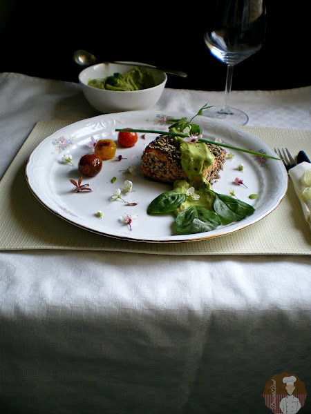 Servimos cada lomo de salmón con un poco de crema de aguacates y albahaca; unos tomates cherrys a la plancha, son una deliciosa guarnición junto a unas hojas frescas de albahaca.