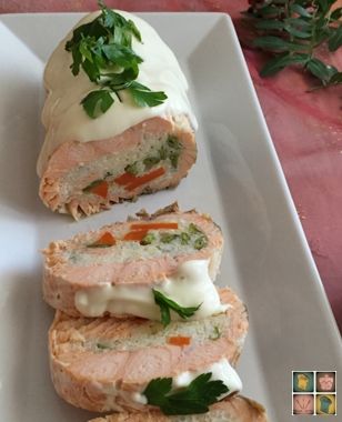 Dejar enfriar y cortar en rodajas (frío se corta mejor), a la hora de servir atemperar en el horno, decorar con un poco de perejil y servir con una mahonesa aromatizada al limón.