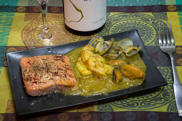 Venga al tajo. El otro día me contaron que en Nutryfish OnLine tenían el salmón salvaje de Alaska en venta durante unas semanas, así que no me pude resistir a probarlo por que te lo envían a casa perfectamente embalado y a temperatura. El salmón salvaje tiene un color un poco más oscuro y la carne más prieta (como yo vamos jajajaj). Esto se traduce en un sabor más marcado y en toda una experiencia gustativa. Para potenciar ese sabor le he añadido una salsa marinera al azafrán que está que quita el sentio"...¿No te lo crees?, pruébalo y me cuentas...