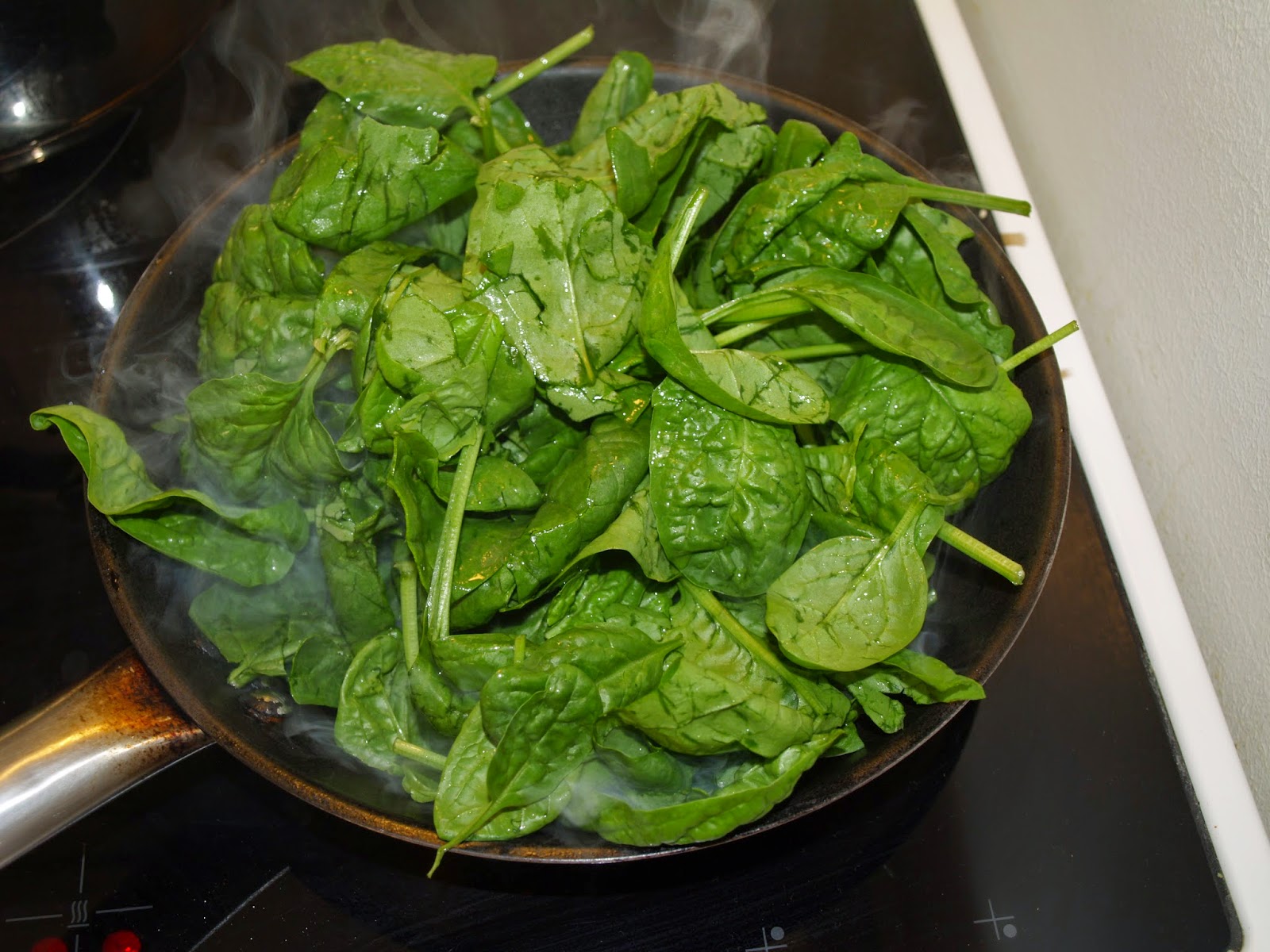 - Vamos con las espinacas: Las lavamos bien y escurrimos. Calentamos una cucharada de aceite de sésamo (o de girasol, por ejemplo, si no tenéis) en una sartén, echamos las espinacas (y un poco de agua: opcional), removemos y tapamos. Dejamos un par de minutos. Destapamos y salteamos hasta que se reduzca todo el agua que hayan soltado. Reservamos.
