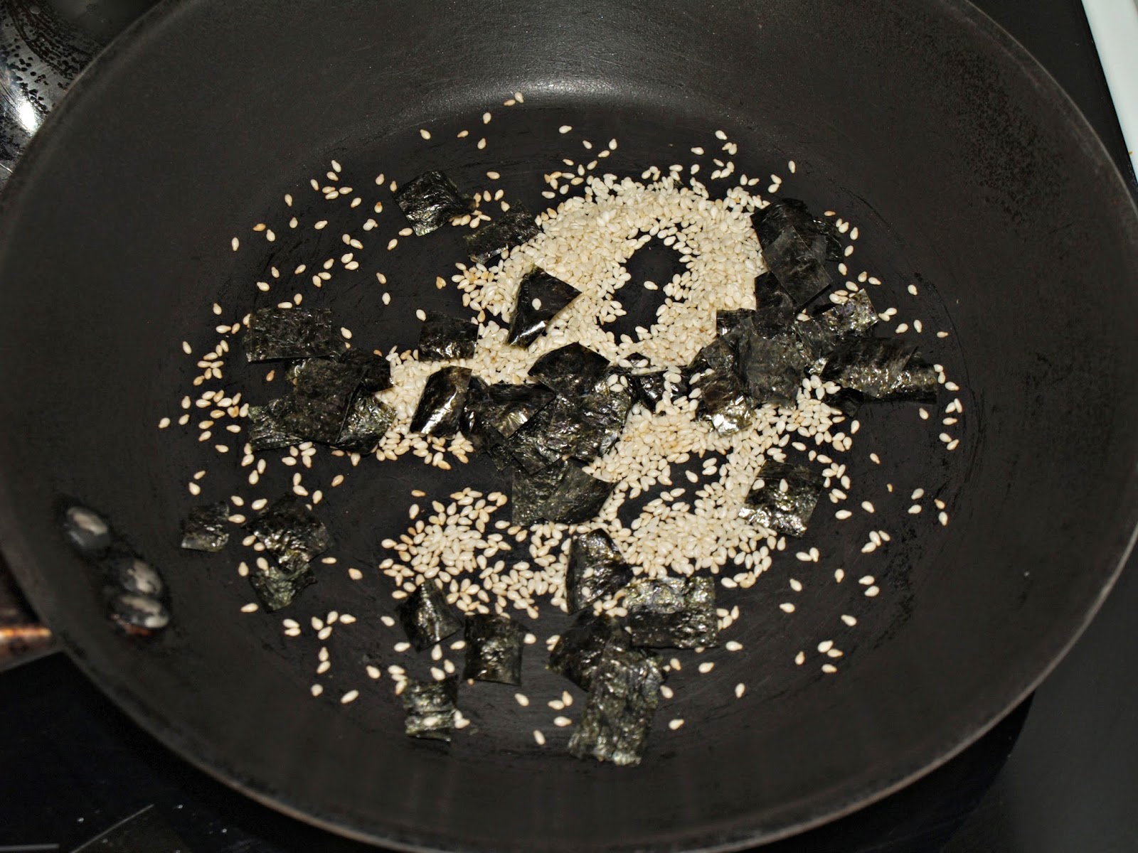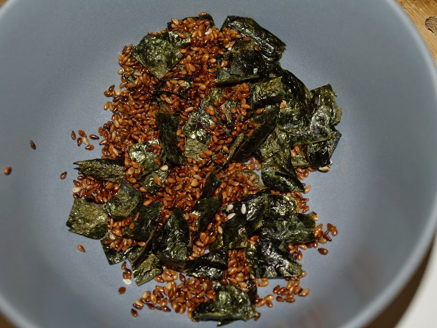 - En una sartén caliente tostamos, durante 1 o 2 minutos, las semillas de sésamo y el alga nori cortadas en tiras o cuadrados. Reservamos.