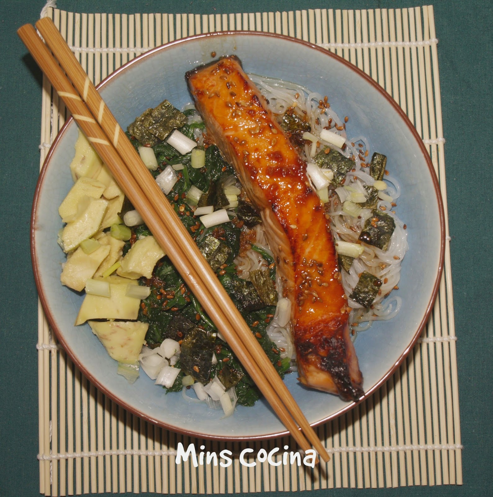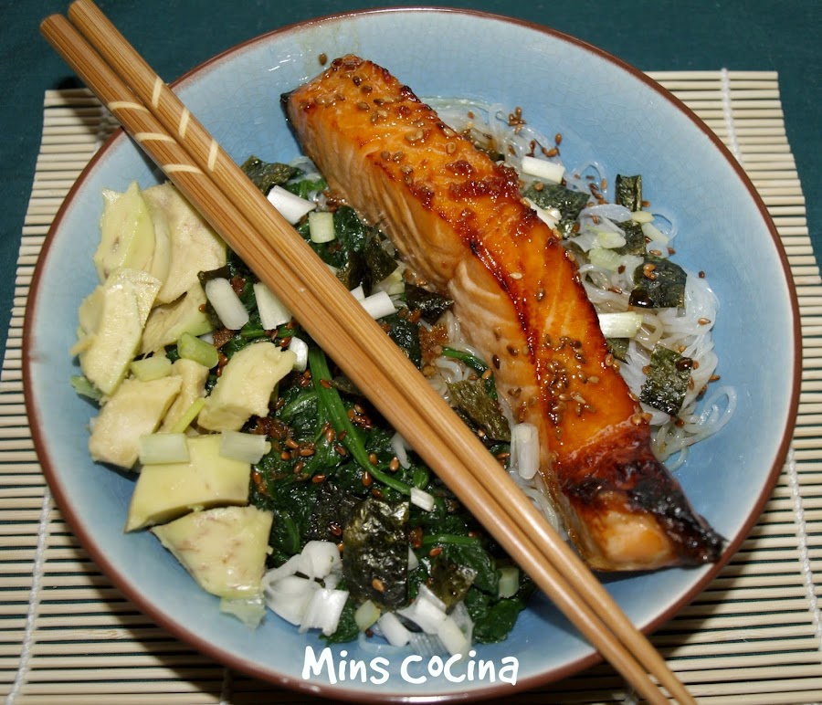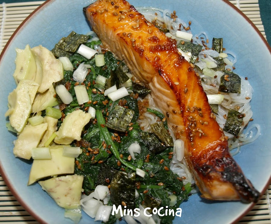 Hacía tiempo que tenía en mente esta receta (adaptada del blog Panning The Globe) y, por fin, este pasado fin de semana la hice. Tengo que decirlo: qué delicia! Aunque nunca lo había preparado yo misma, había probado el pollo Teriyaki pero nunca el salmón y, como digo, tenía muchas ganas. Y así en un bol, con noodles, verduras y el toque del sésamo y las algas quedó espectacular. Lo de la salsa no tiene palabras. Superó con creces mis expectativas, que ya eran altas. Y además: sin azúcar.