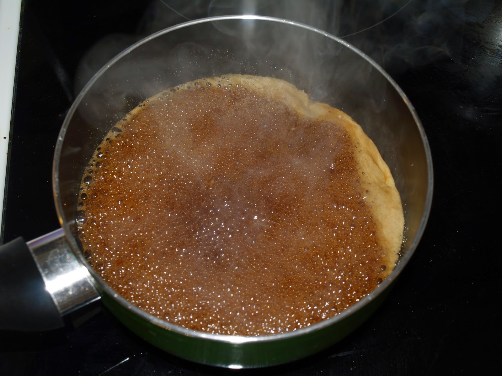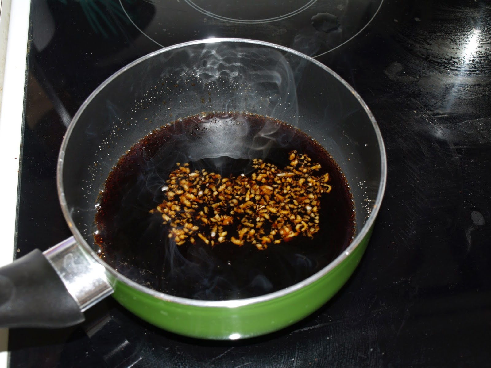 - A continuación, ponemos en un cazo o una sartén la salsa de soja, el mirin, el azúcar o edulcorante, el jengibre y el ajo (estos dos últimos son opcionales pero os los aconsejo totalmente. Le dan un gusto exquisito a la salsa). Calentamos hasta que de un buen hervor, fuerte, y entonces bajamos a fuego medio - bajo y dejamos hacer hasta que veamos que la salsa se liga o espesa, unos diez minutos. No va a espesar demasiado, no os esperéis una pasta ni mucho menos, al menos con el edulcorante, pero luego, más adelante, según se enfríe, lo hará y bastante.