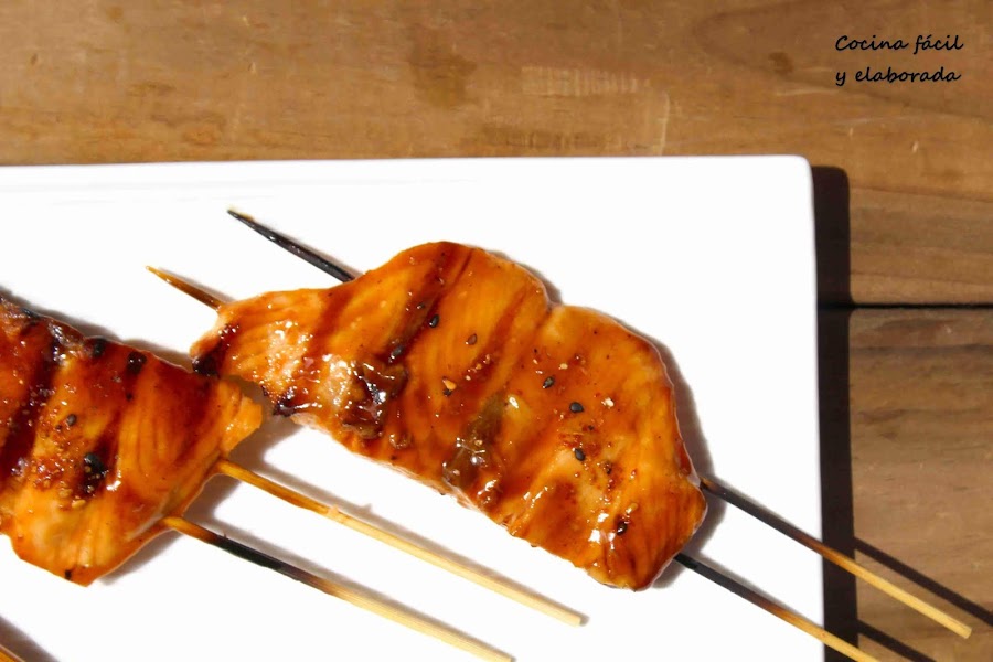 Sacamos y hacemos brochetas de dos trozos de salmón (yo uso dos palillos ya que el salmón es frágil y es difícil manipular la brocheta y se puede partir).