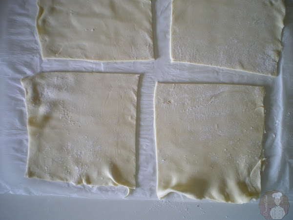 Extender la lámina de hojaldre y cortarla en 4 partes iguales. (aproximadamente 10x10 cm) . Pincelar los bordes del hojaldre para que selle mejor al cerrarlo.