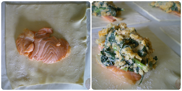 Sobre cada trozo de hojaldre, colocar una porción de lomo de salmón y sobre éste, una parte del relleno de espinacas y queso.