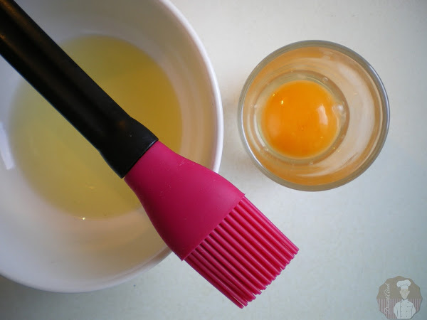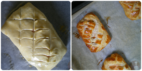 Pincelar cada trozo con la yema ligeramente batida con un poco de agua. Hacer unos cortes muy leves sobre la superficie superior de cada trozo. Hornear a 180ºC durante 10-12 minutos o hasta que el hojaldre haya cogido color sin quemarse.