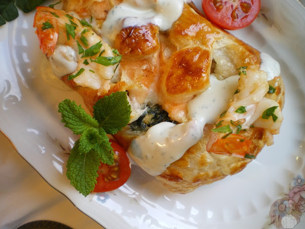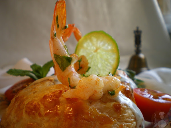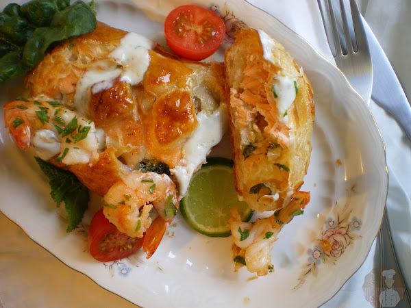 Una vez en su punto, retiramos del horno los salmones hojaldrados y acompañamos con los langostinos salteados y un poco de salsa mahonesa o alioli y muchas ganas de disfrutar de un excelente bocado.